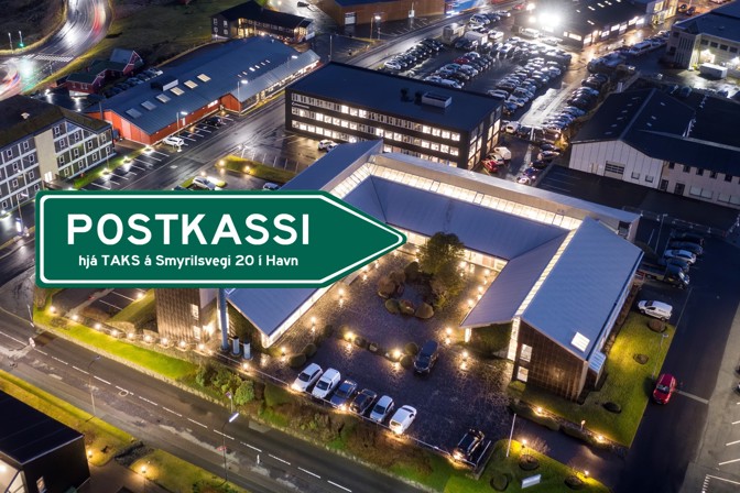 Postkassin hjá TAKS er við høvuðsdyr okkara á Smyrilsvegi 20 í Havn.