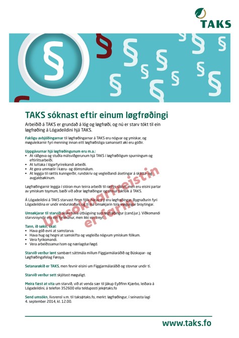 Gomul starvslýsing hjá TAKS. Umsóknarfreistin er farin. Til ber ikki at søkja starvið.